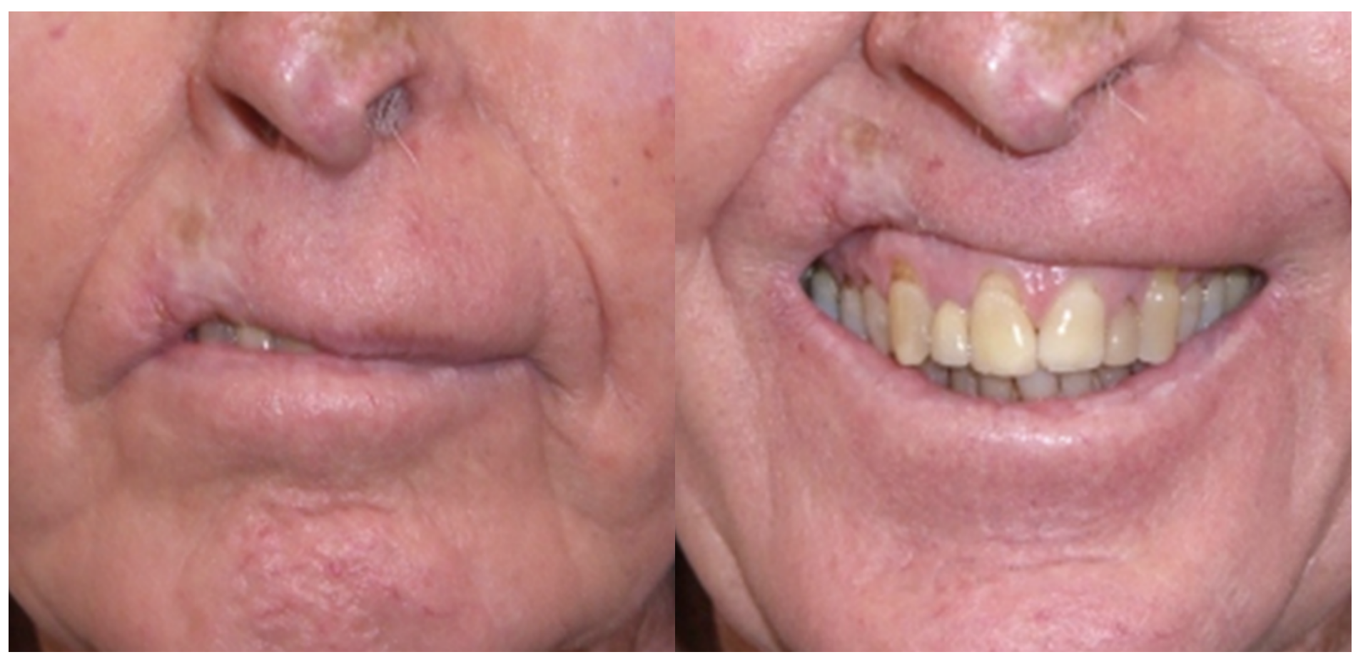 These side effects are caused by increased fibrosis as the fraction size has been too big, meaning that the repair capacity of the normal cells has been exceeded and normal cells have died and have been replaced by fibrous tissue within the radiation field. These side effects are avoided with adequate fractionation. The second figure shows the same person with who is now smiling. One can see that this these late effects from the radiotherapy have caused a functional deficit in the way this person smiles.